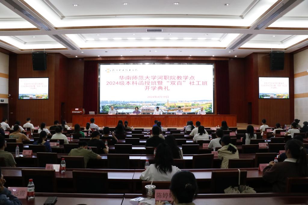 4月19日,我校在学术交流中心报告厅举行华南师范大学河职院教学点2024级本科函授班暨“双百”社工班开学典礼,袁光华副校长、河源市民政局罗海文科长、继续教育学院相关工作人员以及2024级本科函授班暨“双百”社工班全体新生参加了开学典礼,华师大继续教育学院吴祖兴副书记通过视频在开学典礼上讲话。河职院继续教育学院李文萍院长主持开学典礼。
