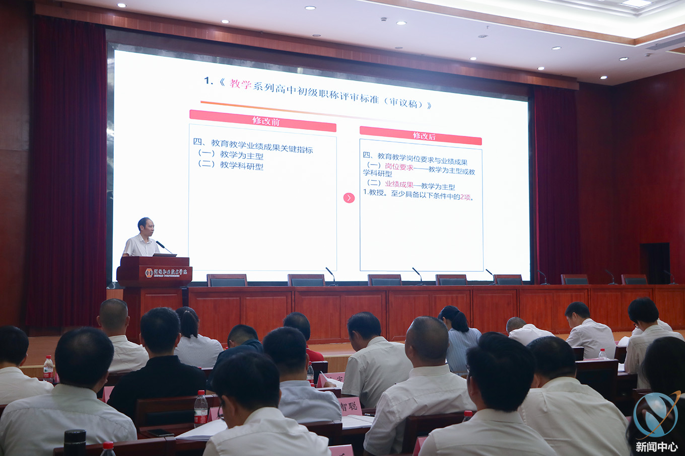 在会议上,学校党委委员、组织人事处处长黄建华从2023年职称评审概况、修订原则及修订内容等方面对《乐投官网职称评审制度文件》的修订情况进行了说明。该文件的修订旨在进一步规范和完善学校的职称评审工作,激励教职工提高立德树人水平、教学水平、学术水平及履行相应职责的能力。
