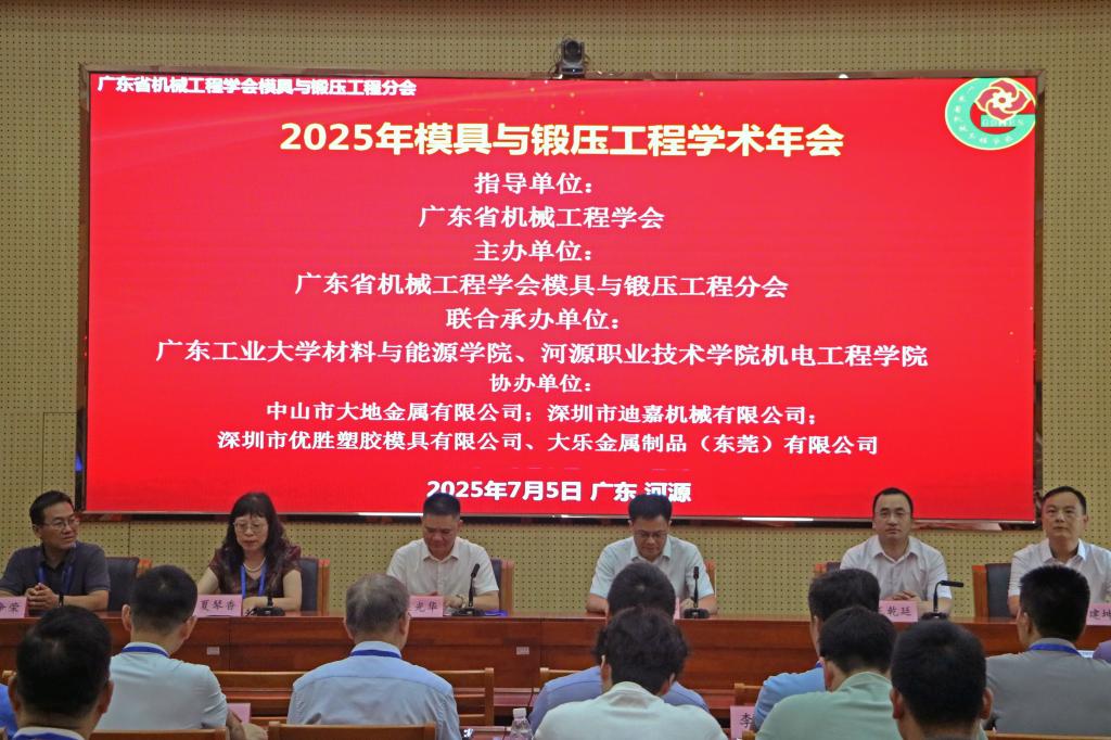 7月4日至6日,2025年广东省机械工程学会模具与锻压工程分会学术年会在我校成功召开。此次学术年会的主题为“创新驱动 智造未来:以新质生产力引领模具与锻压技术高质量发展”。会议由广东省机械工程学会主办,广东工业大学材料与能源学院、我校机电工程学院联合承办,中山市大地金属有限公司、深圳市迪嘉机械有限公司、深圳市优胜塑胶模具有限公司、大乐金属制品(东莞)有限公司等单位协办。广东省机械工程学会领导及会员,大会报告特邀嘉宾,华南理工大学、广东工业大学等专家学者,袁光华副校长、机电工程学院钟建坤院长等,校内外共一百余人参加活动。