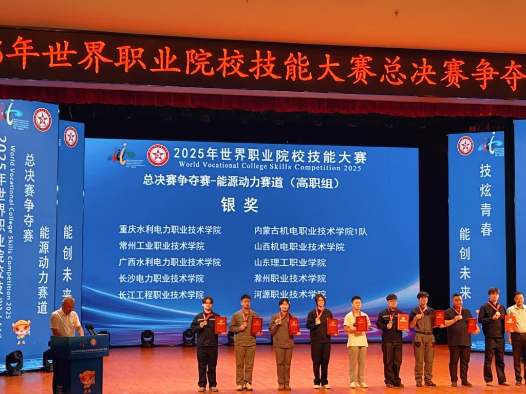 9月6日至9日,2025年世界职业院校技能大赛总决赛争夺赛能源动力赛道高职组在兵团兴新职业技术学院举行。来自全国29个省区市和兵团的102支参赛队伍齐聚一堂、同台竞技、展示风采,我校电信学院苏文斌、罗坤明作为指导老师,带领黄金文、洪楚武、纪梓欣、吴书堉四位同学参加此次竞赛。参赛队伍在比赛中突破重重困难、发挥出色,展现出扎实的专业基础和综合素养,成功斩获银奖。