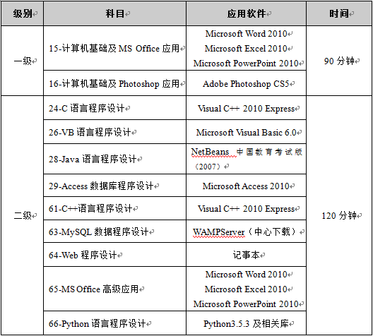 NCRE各科目考试软件列表