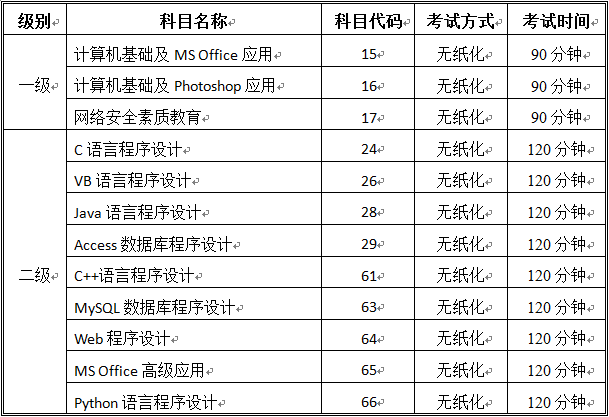 2019年9月全国计算机等级考试开考科目(乐投官网考点)