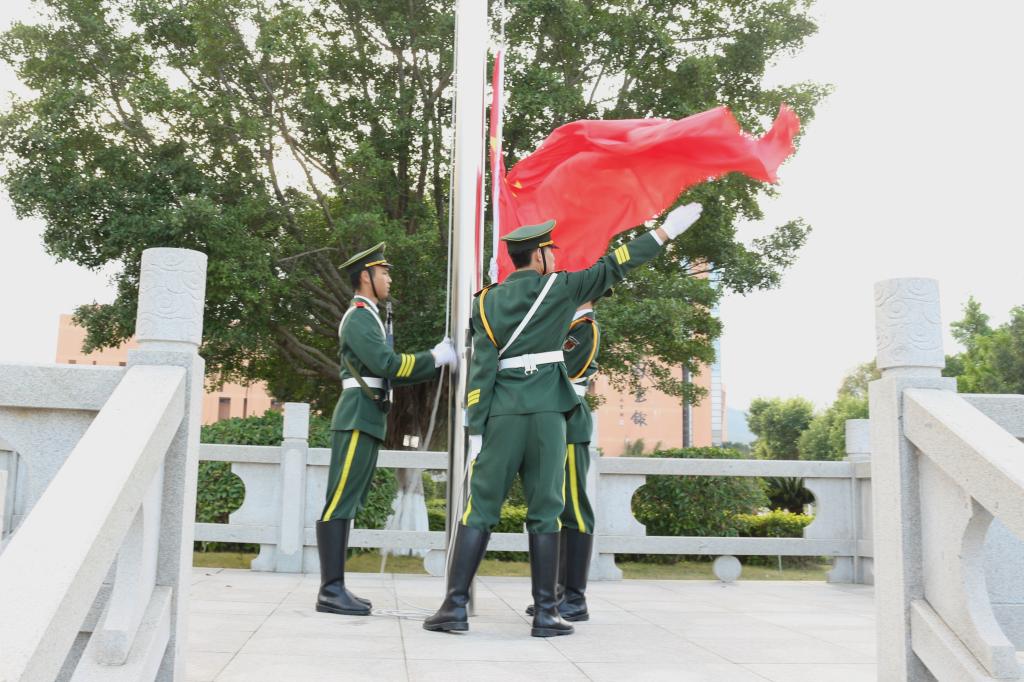 在全院师生的瞩目下,英姿飒爽的国旗护卫队队员们护送鲜艳的五星红旗来到升旗台前,伴随着庄严的国歌,五星红旗冉冉升起,迎风飘扬。