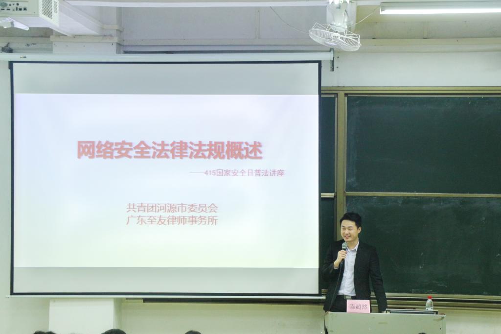4月16日晚19:30,在第四个“4.15”全民国家安全教育日到来之际,由乐投官网和源城区法律援助处联合举办的“4.15”全民国家安全教育日普法讲座在教学楼D107教室举行。广东至友律师事务所陈超然律师应邀担任此次普法讲座的主讲人,人文学院办公室主任刘少燕老师、团市委有关人员、乐投官网法律诊所、法律协会师生以及众多来自不同专业的学生参加了此次讲座,现场气氛热烈。