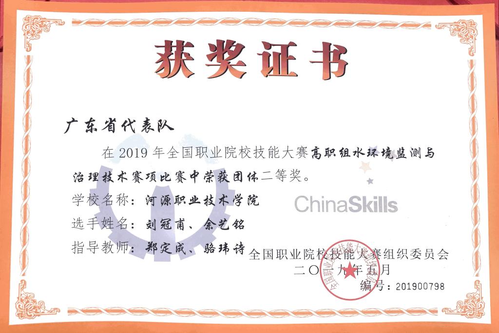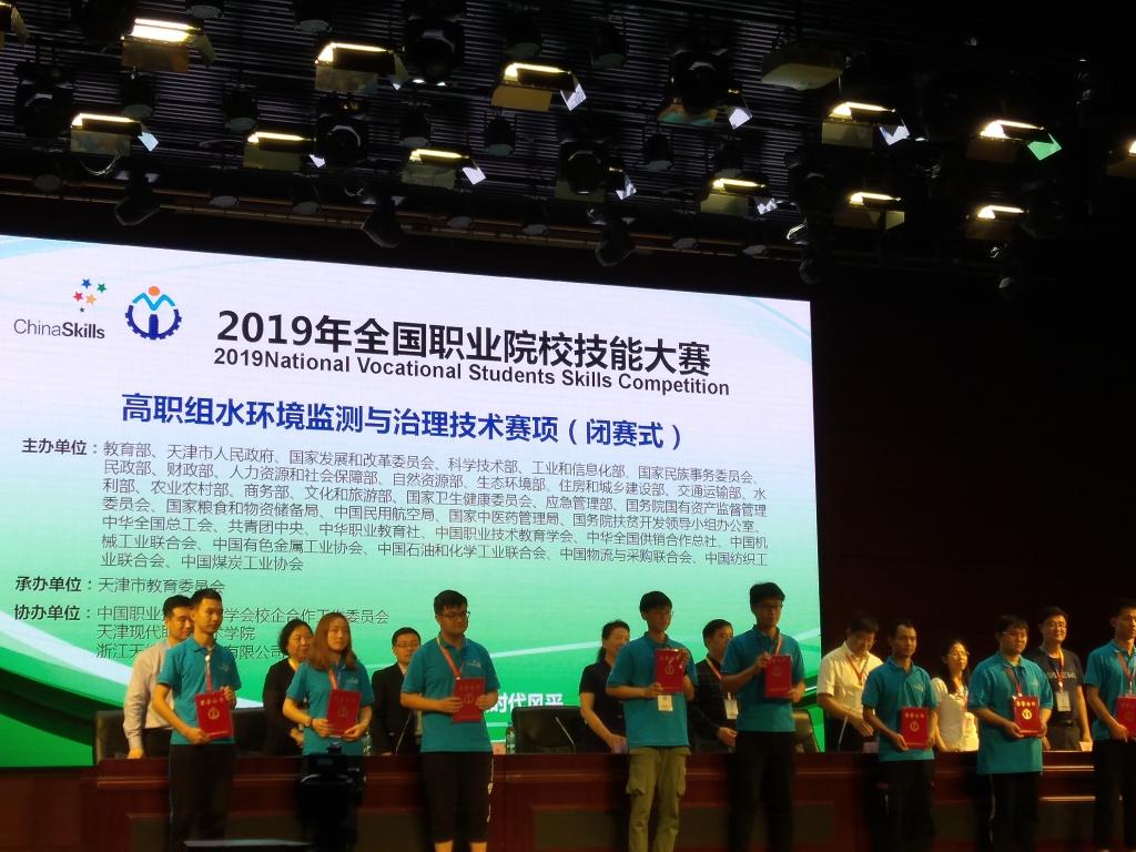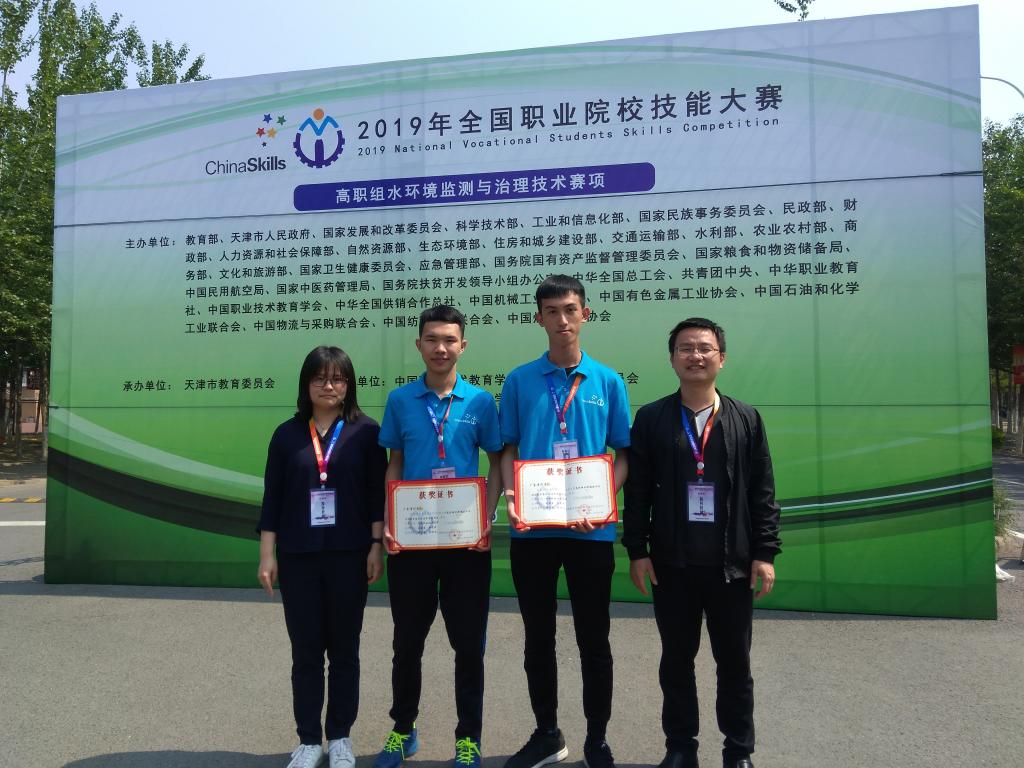 5月11日上午9点,2019年全国职业院校技能大赛高职组水环境监测与治理技术赛项闭幕式在天津现代职业技术学院举行。本次比赛于5月9日至10日在天津现代职业技术学院举行,共有来自全国26个省市的79支队伍共158名选手参赛。乐投官网安全健康与环保专业的刘冠甫、余艺铭两位同学代表广东省参加比赛,在郑定成、骆玮诗两位老师的指导下,在比赛中沉着冷静,克服了一系列困难,以全国排名第十二的成绩获得高职组团体二等奖,为学校争得荣誉。