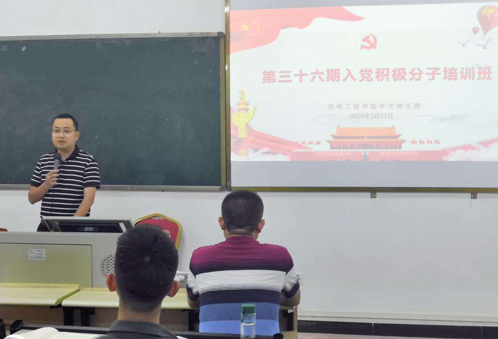 5月31日晚,机电学院第三十六期入党积极分子培训班开班仪式暨《做有理想有本领有担当的新时代青年》主题培训会在实D312举行,学院党总支副书记黄亮、团总支书记杨成、学生党支部书记黄章华、授课教师邹建辉副教授、学生党支部宣传委员张燕华、组织委员赵雯钊及53位入党积极分子参加了此次活动,活动由团总支杨成书记主持。
