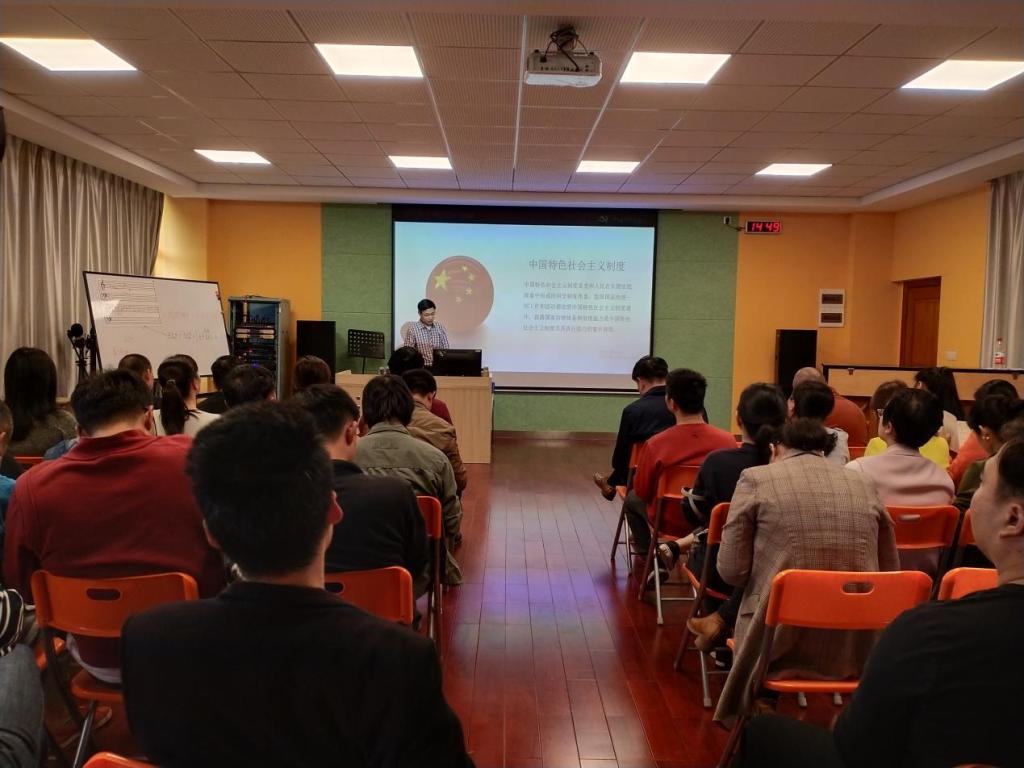 首先,由杜伟祥院长从十九届四中全会背景、工作总结、主要内容、指导思想、总体目标以及工作要求等六个方面进行了解读。重点强调了全党全国各族人民要更加紧密地团结在以习近平同志为核心的党中央周围,坚定信心,保持定力,锐意进取,开拓创新,为坚持和完善中国特色社会主义制度、推进国家治理体系和治理能力现代化,实现“两个一百年”奋斗目标、实现中华民族伟大复兴的中国梦而努力奋斗!要求与会的党员同志必须增强“四个意识”、坚定“四个自信”、做到“两个维护”,把思政教育融入到我们的课堂中去,坚持培养思想过硬、知识丰富的优秀人才的目标,为社会为国家输送高素质人才。