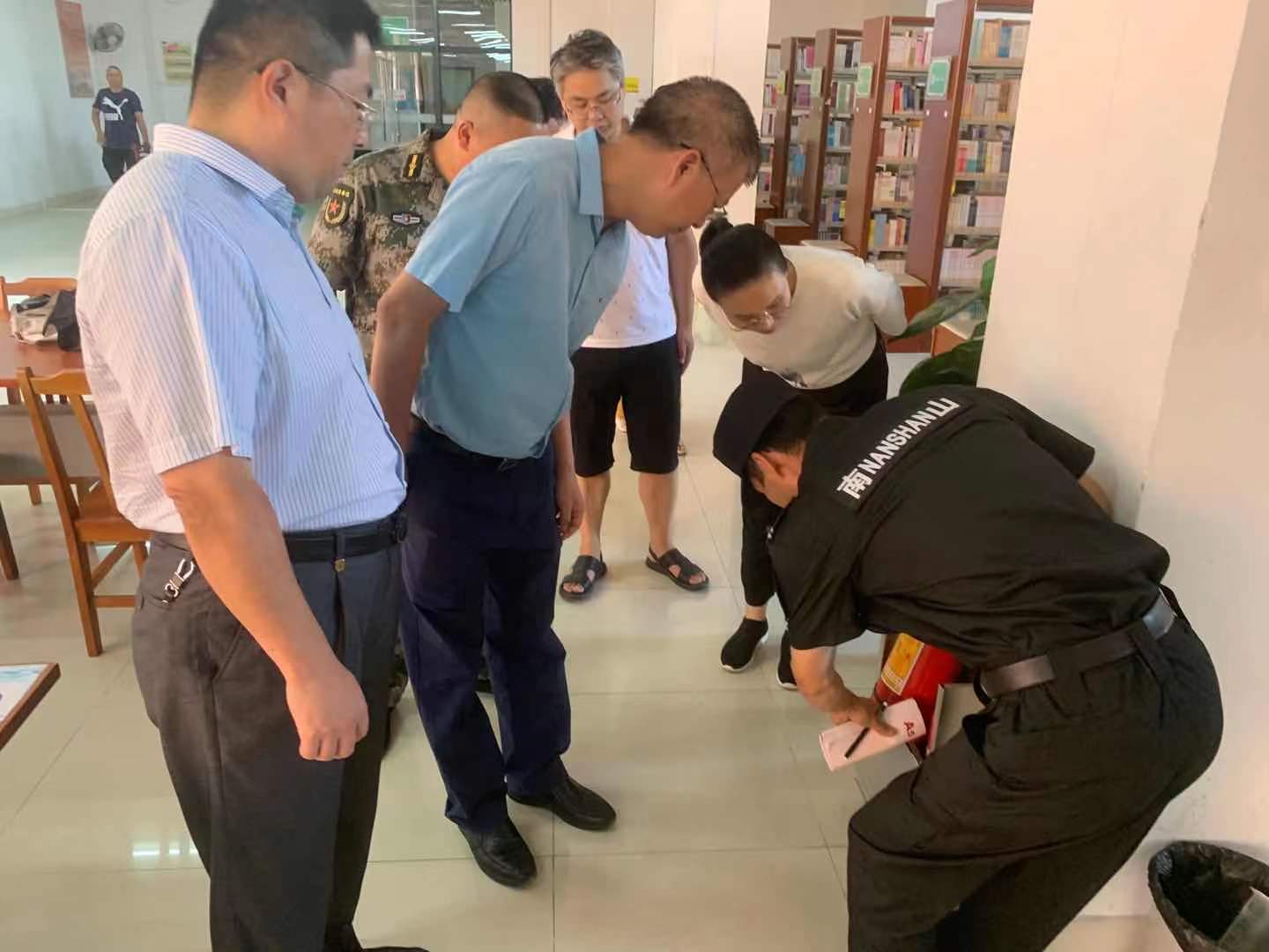 张国勇等人冒着酷暑,对图书馆A、B、C区进行了全面详细的检查。每到一处对消防设备设施、电线电路、监控设施、疏散通道及安全出口等认真排查,不放过任何一个环节,任何一个细节。对检查中发现的问题隐患逐一商讨整改措施,需有关部门协调解决的,及时报送并专人跟进,确保各项安全隐患问题得到解决落实。