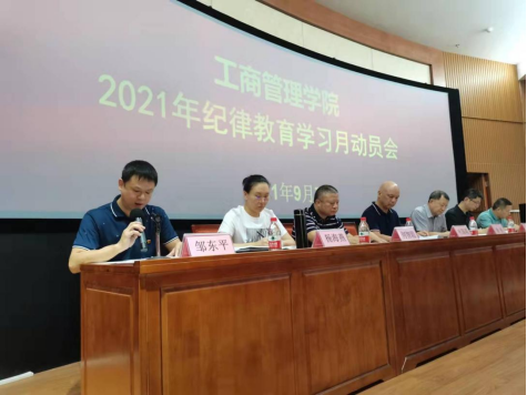 为深入贯彻全面从严治党、从严治校,推进党风廉政建设高质量发展,9月7日下午,工商管理学院召开以“学党史悟思想,守纪律铸忠诚”为主题的纪律教育学习月活动动员大会。学校党委副书记、纪委书记叶国英同志和学院全体教职工参加会议。